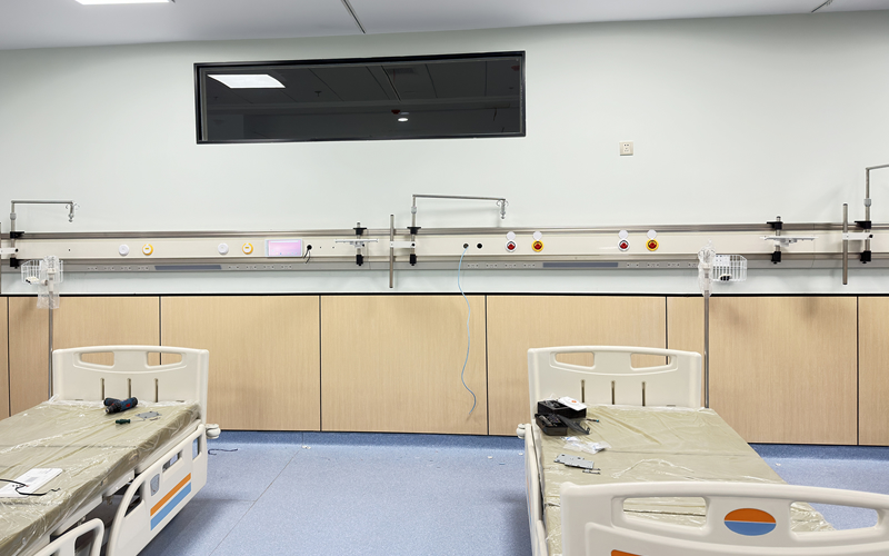 CCU病房采用多功能導(dǎo)軌式設(shè)備帶,床頭配置可移動式導(dǎo)軌托架、掛鉤、器械框以及醫(yī)用氣體和醫(yī)護對講設(shè)備。