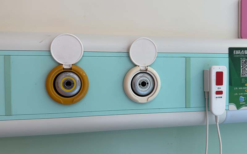 醫(yī)用中心供氧系統(tǒng)的終端配置與末端設施應根據(jù)臨床使用需求確定。終端由快速接頭插座,可插入氧氣濕化吸入器、麻醉機和呼吸機等醫(yī)療器械的氣體插頭組成。終端組件應符合YY 0801.1-2010《醫(yī)用氣體管道系統(tǒng)終端 第1部分:用于壓縮醫(yī)用氣體和真空的終端》的要求。醫(yī)用氧氣二級穩(wěn)壓箱宜采用雙回路設計,配置雙減壓器,工作壓力為0.2MPa至0.5MPa,并應帶應急接口,可在緊急情況下直接連接氧氣瓶實現(xiàn)緊急供氧。氧氣流量計應具備累計流量和瞬時流量顯示功能,并配置數(shù)據(jù)遠傳模塊。